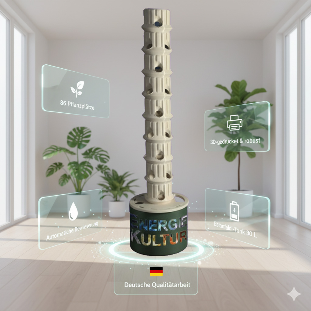 Unser innovativer Hydroponik Turm ist das Herzstück des Energie-Systems. Mit ElektroKultur Komponenten kann eine ganz spezifische Energieversorgung aufgebaut werden.